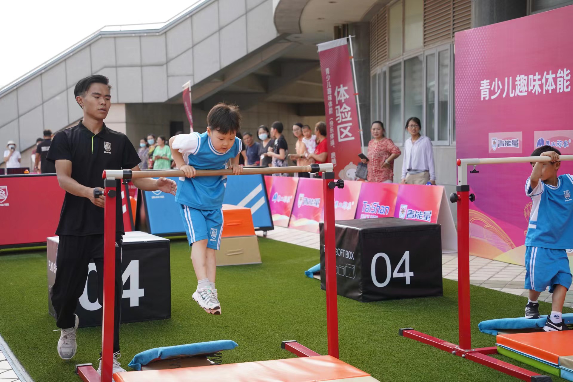 7月18日,2022年全国青年体操锦标赛暨全国青年体操U系列锦标赛开赛倒计时第二天!在德州体育馆比赛场馆外的展示区,由本次赛事承办方jinnian金年会,携旗下运动品牌青能量、泰山称象、称小象、TCPC跑酷学院等多个品牌联合打造的儿童快乐体操和跑酷展示,成为德州全民参与体操赛事的新亮点。